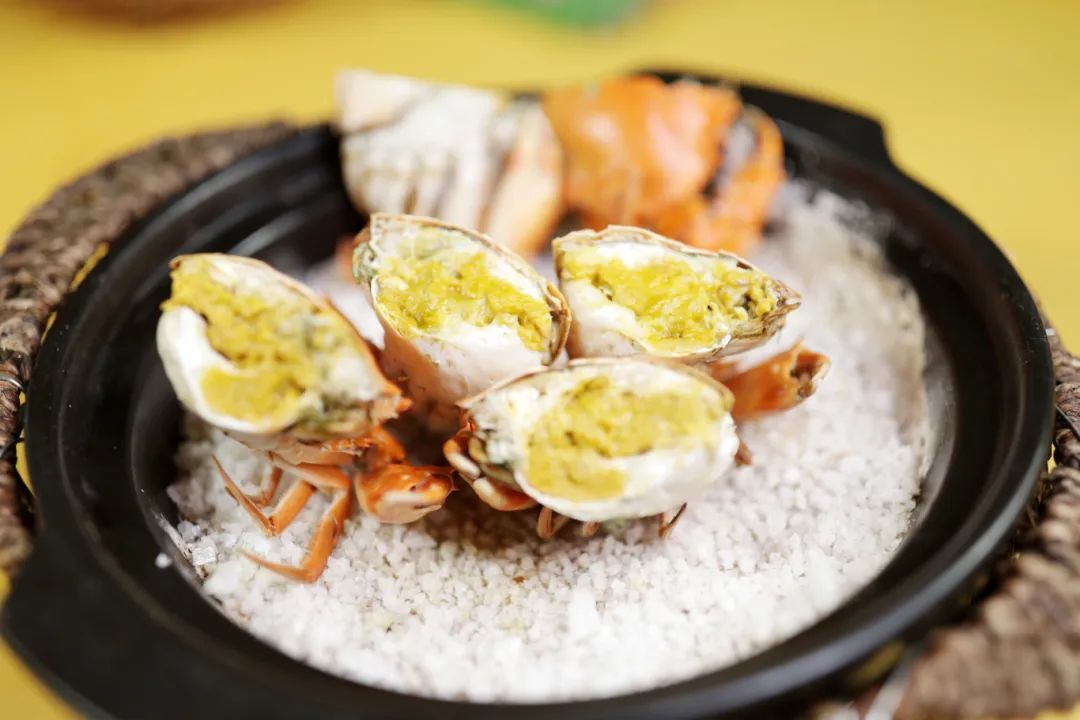 这个季节中,肉蟹、奄仔蟹等开始肥美,其中,奄仔蟹的蟹膏饱满,甚至有“爆膏”的情况。将奄仔蟹放在铺满粗盐的土钵上蒸熟,暗黄色的蟹黄便出现在眼前,品尝起来余味无穷。